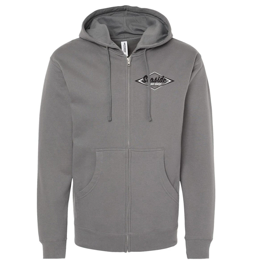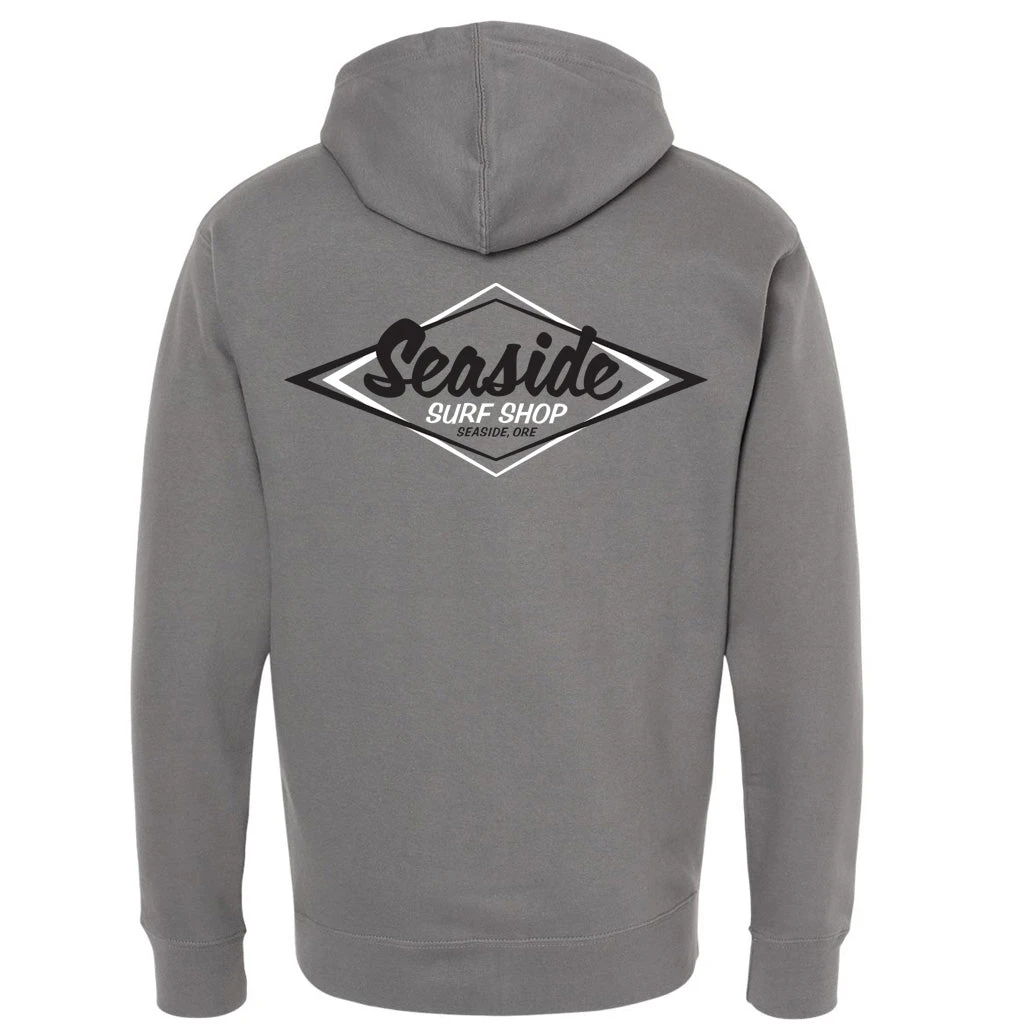 A classic-style Seaside Surf Shop logo on a cozy soft hooded sweatshirt with a zipper.
